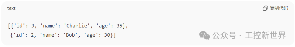 • 排序:按 age DESC → Charlie(35)、Bob(30)