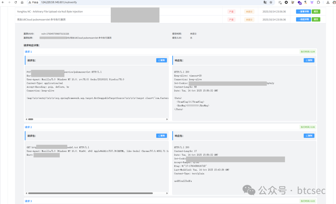 用友U8Cloud pubsmsservlet 远程代码执行漏洞(QVD-2025-39606),该漏洞存在于U8Cloud所有版本提供的pubsmsservlet接口,服务端对接收的数据进行反序列化操作时未对数据进行有效的校验,导致攻击者可发送精心构造的恶意序列化对象,在服务端执行任意代码。