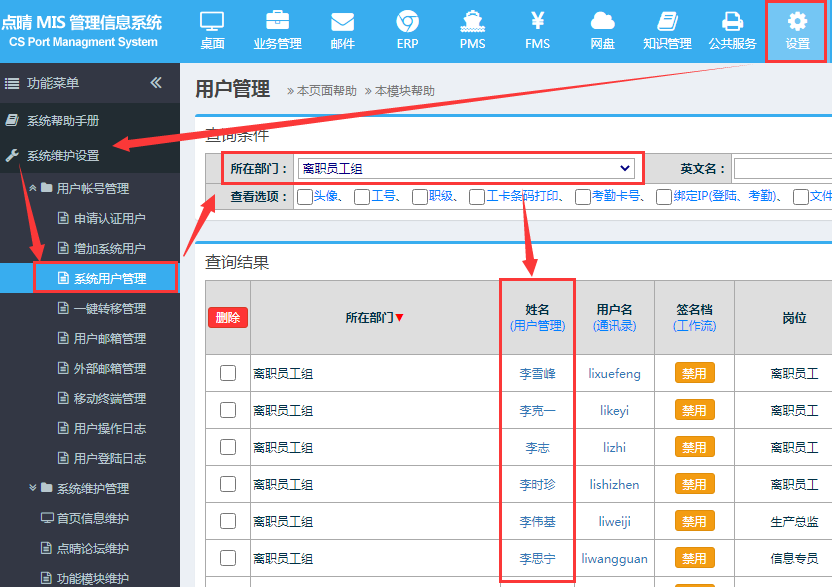 由于点晴OA系统是以用户的英文名作为系统的唯一识别号,并且用户的邮箱名就是:英文用户名@企业域名,系统所有模块都是以该英文用户名作为用户识别和记录的,所以该英文用户名是不允许重复的!已经产生登录和系统操作记录的用户禁止删除,只能归类到离职员工组。如果删除的话可能导致系统逻辑错误,例如某个会议明明记录了某个人参加了会议,并且该员工做了回复,如果直接删除的话会导致找不到这个员工的姓名和部门等信息而报错;或者是以后有同用户名的用户根本没做过某件事情,而系统显示他几年前做过某件事情!点晴MIS系统采用的是MS SQL Server大型数据库,作为OA用途而言完全不用担心离职用户占用的空间容量问题。